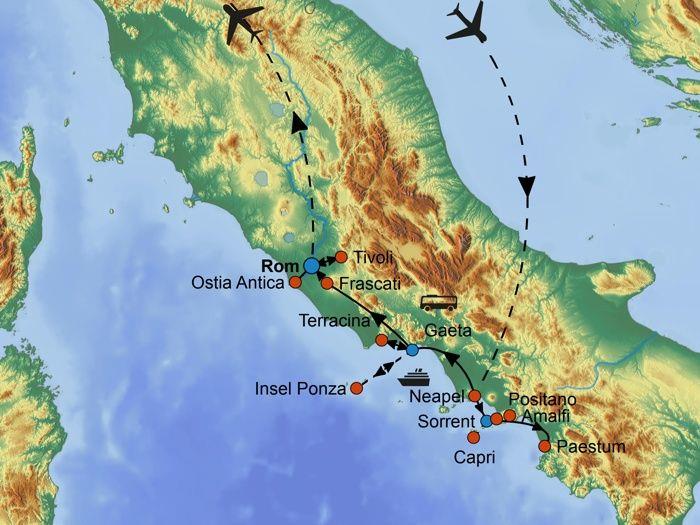 Diese Reise führt uns zuerst in die italienische Region Kampanien. Die ersten fünf Nächte verbringen wir in Sorrent am Golf von Neapel. Von dort aus starten wir zu Entdeckungsfahrten zur Insel Capri, zur Amalfiküste und zu den Ausgrabungen von Pompeji und Paestum. Natürlich besuchen wir auch Neapel. Anschließend fahren wir weiter nach Gaeta, wo wir die nächsten drei Nächte wohnen. Ein Ausflug zu den latinischen Küstenorten am Tyrrhenischen Meer sowie zur Insel Ponza stehen dort auf dem Programm. Zum Abschluss reisen wir in die Hauptstadt Rom, wo wir die letzten vier Nächte bleiben.