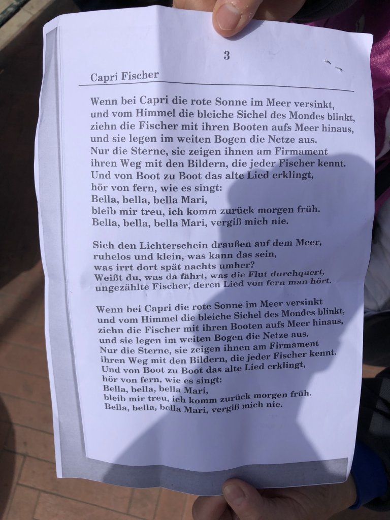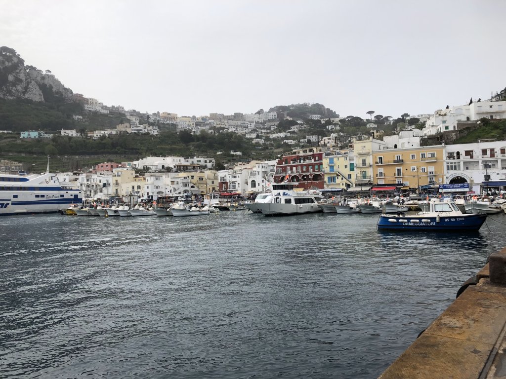 Um 09.40 Uhr fahren wir mit einem Schnellboot zur Insel Capri. Ein örtlicher Bus bringt uns um 09.00 Uhr vom Hotel hinunter zum Hafen, da unser Bus dort nicht hinfahren darf. Die Überfahrt dauert etwa 30 Minuten.